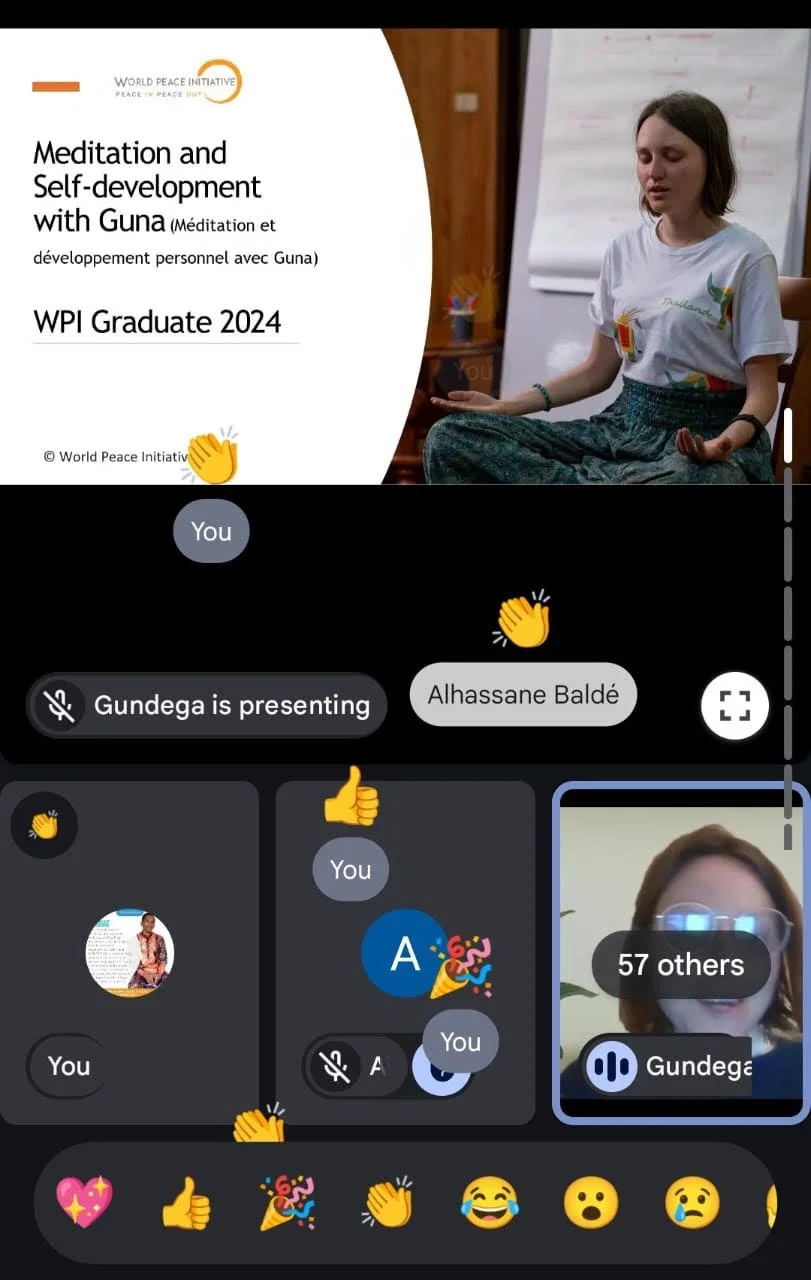 Paldies manam kolēģim Ibrahima no World Peace Initiative, kurš mani uzaicināja novadīt sesiju! Es atguvu pārliecību, ka varu darboties kā meditācijas trenere, un ka nav nepieciešams zināt valodu, lai kopā meditētu un sajustu mirkli miera un vienotības!